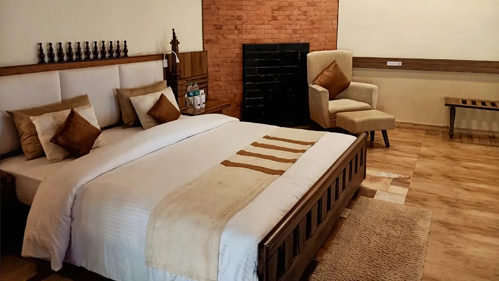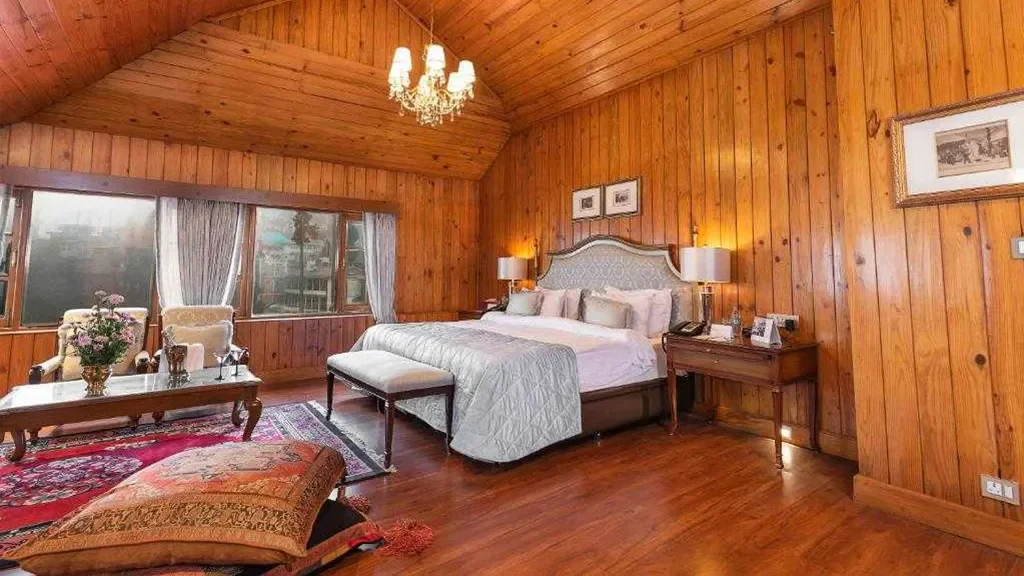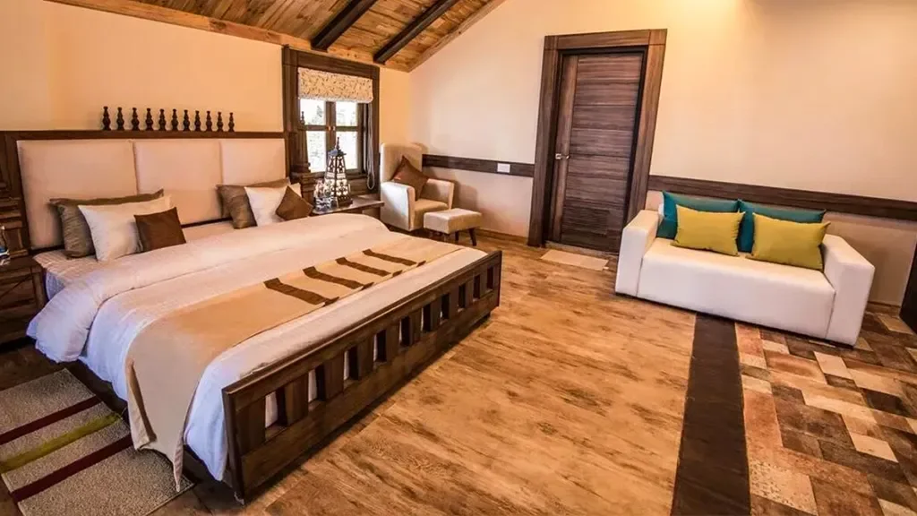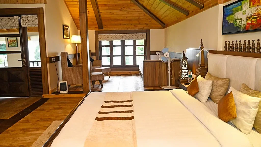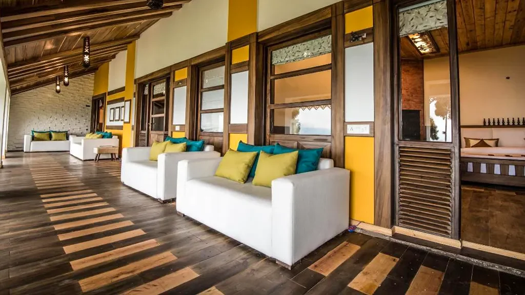 The retreat reflects traditional hill architecture with warm interiors and natural materials. The design complements the surrounding landscape rather than dominating it.