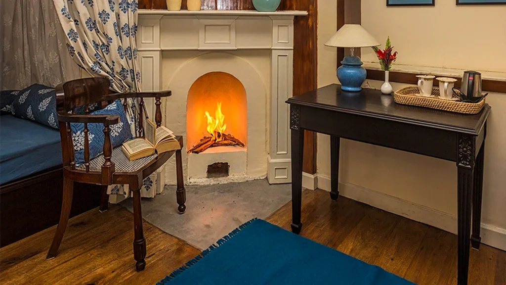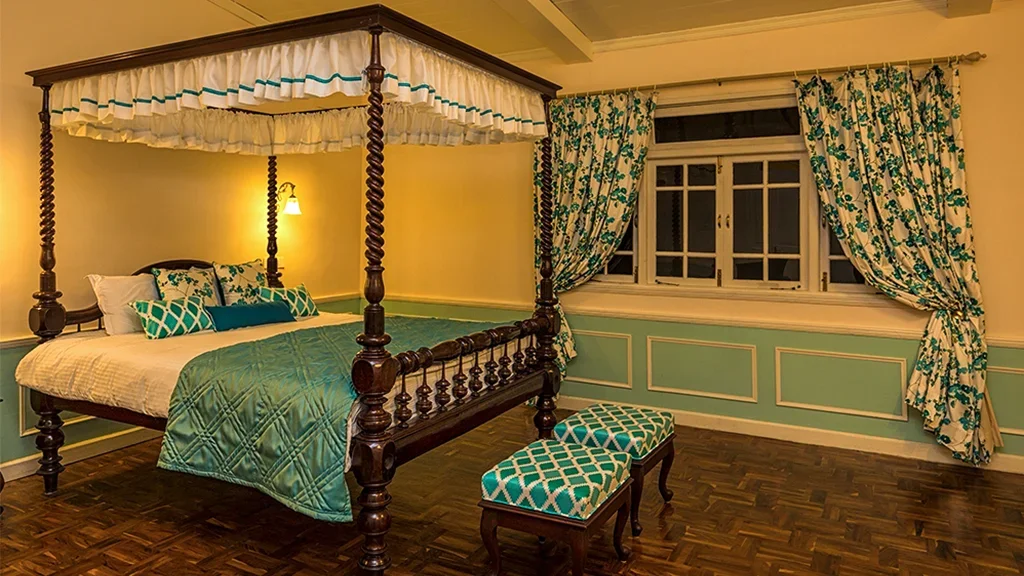 The retreat reflects the elegance of British era plantation homes, featuring spacious interiors, classic furnishings, and open verandahs overlooking tea gardens.