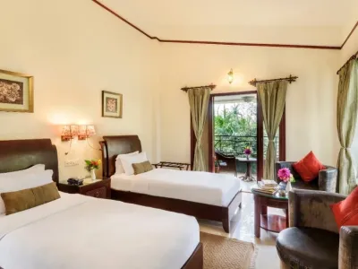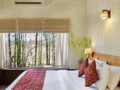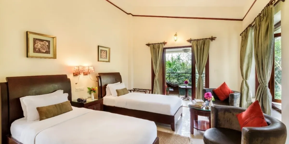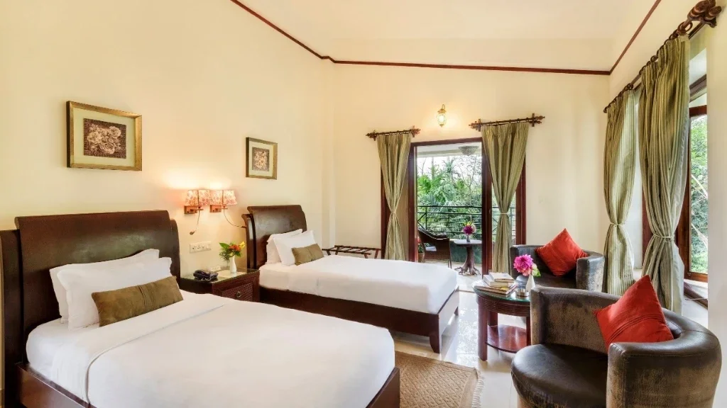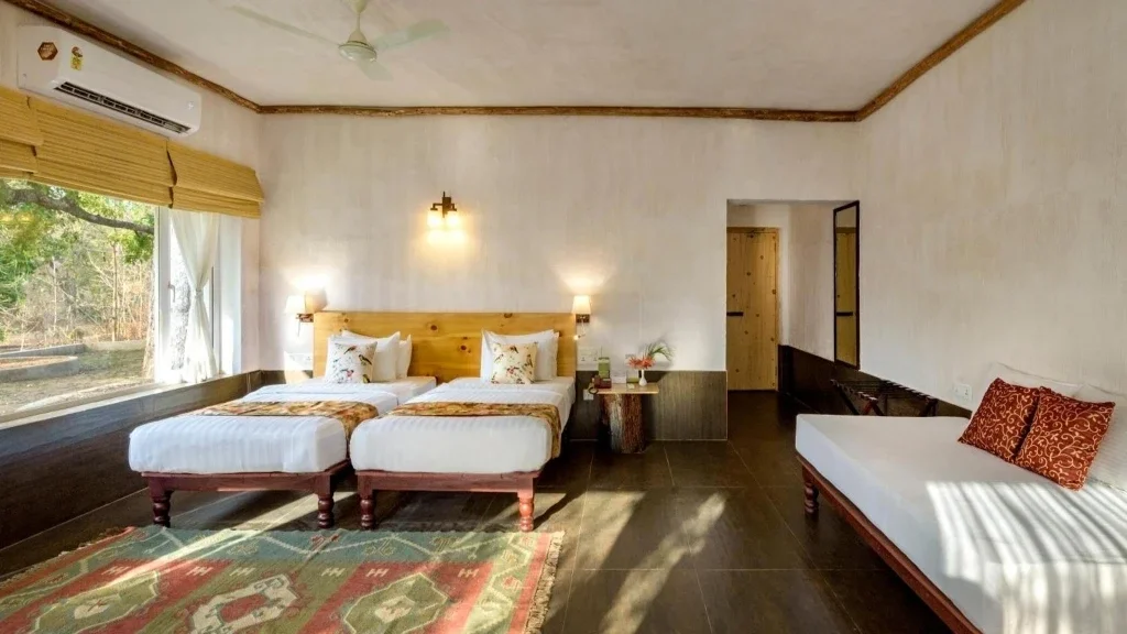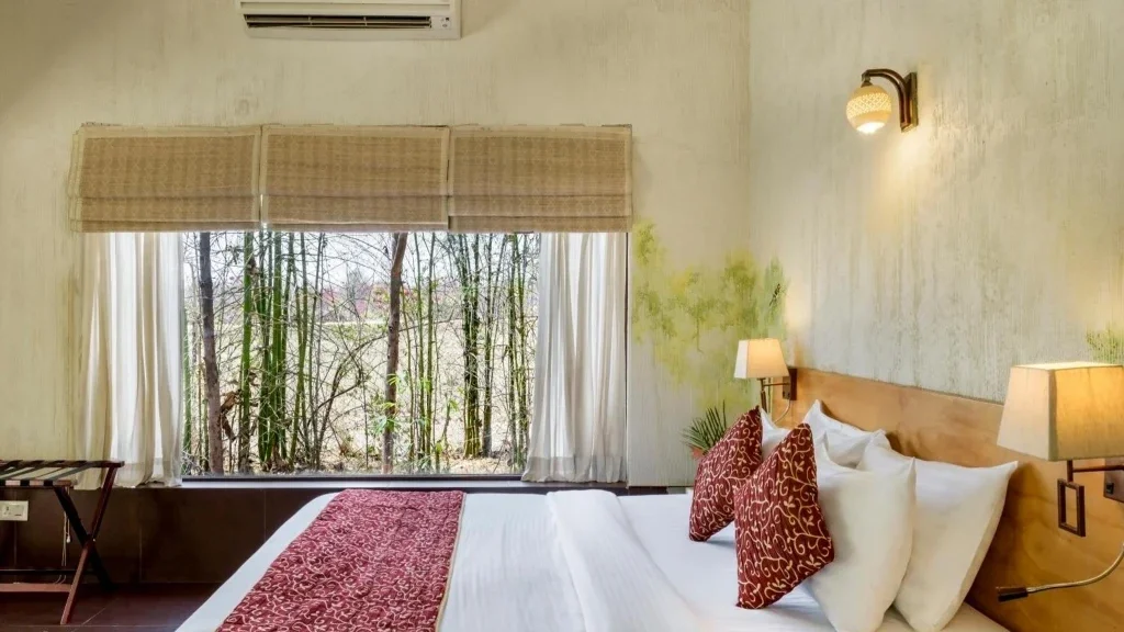 Room amenities include comfortable beds, air conditioning, attached modern bathrooms, tea and coffee facilities, and essential in-room conveniences. The calming ambience of the rooms ensures a restful experience after a day spent exploring the forests and nearby attractions.