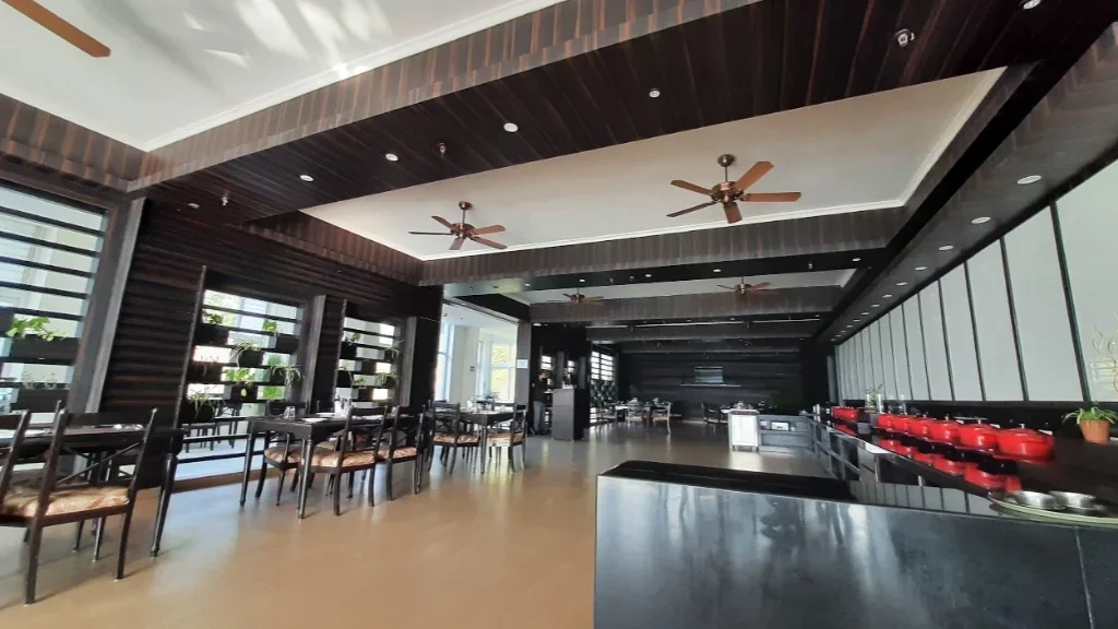 Meals are served in a calm and comfortable setting, allowing guests to enjoy slow, relaxed dining. The restaurant atmosphere complements the peaceful nature of the retreat.