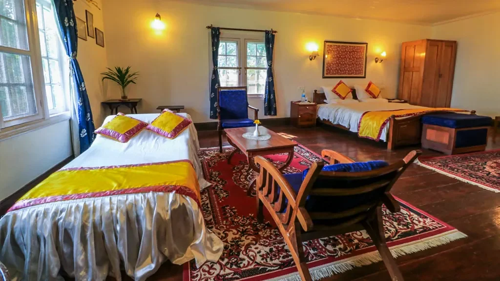 The Living Experience With only four exclusive suites, Tumsong offers privacy, personalized service, and an atmosphere of true stillness. Each suite is decorated in a tasteful fusion of colonial and local styles – wooden floors, vintage four-poster beds, handwoven textiles, and panoramic windows that open to mountain and valley views. Bathrooms are modern and spacious, yet maintain a rustic charm with copper fixtures and natural stone accents. Fireplaces warm the chilly evenings, while handcrafted quilts add a personal, cozy touch. What sets Tumsong apart is that there’s no rush here. Days are slow, meals are leisurely, and the quiet is only interrupted by the rustle of the wind or the soft clink of tea cups.