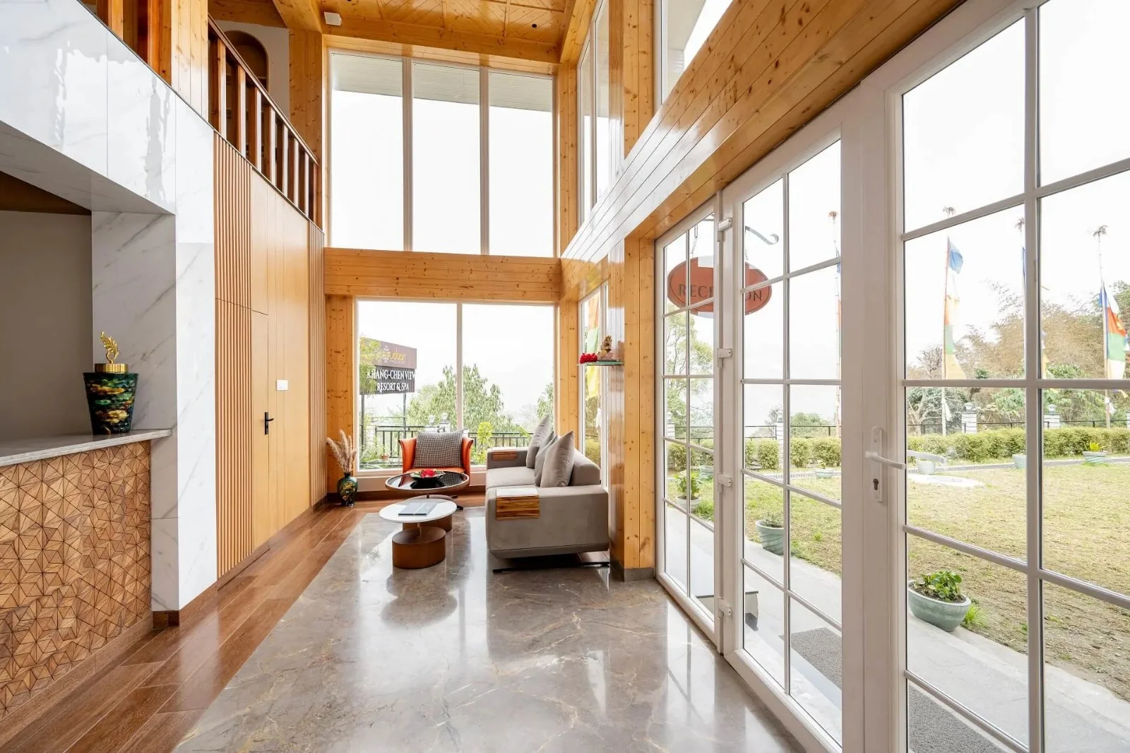 Public areas of the resort are designed to be practical and inviting, offering spaces where guests can relax, plan their day, or enjoy conversation while taking in views of the surrounding hills and forests.